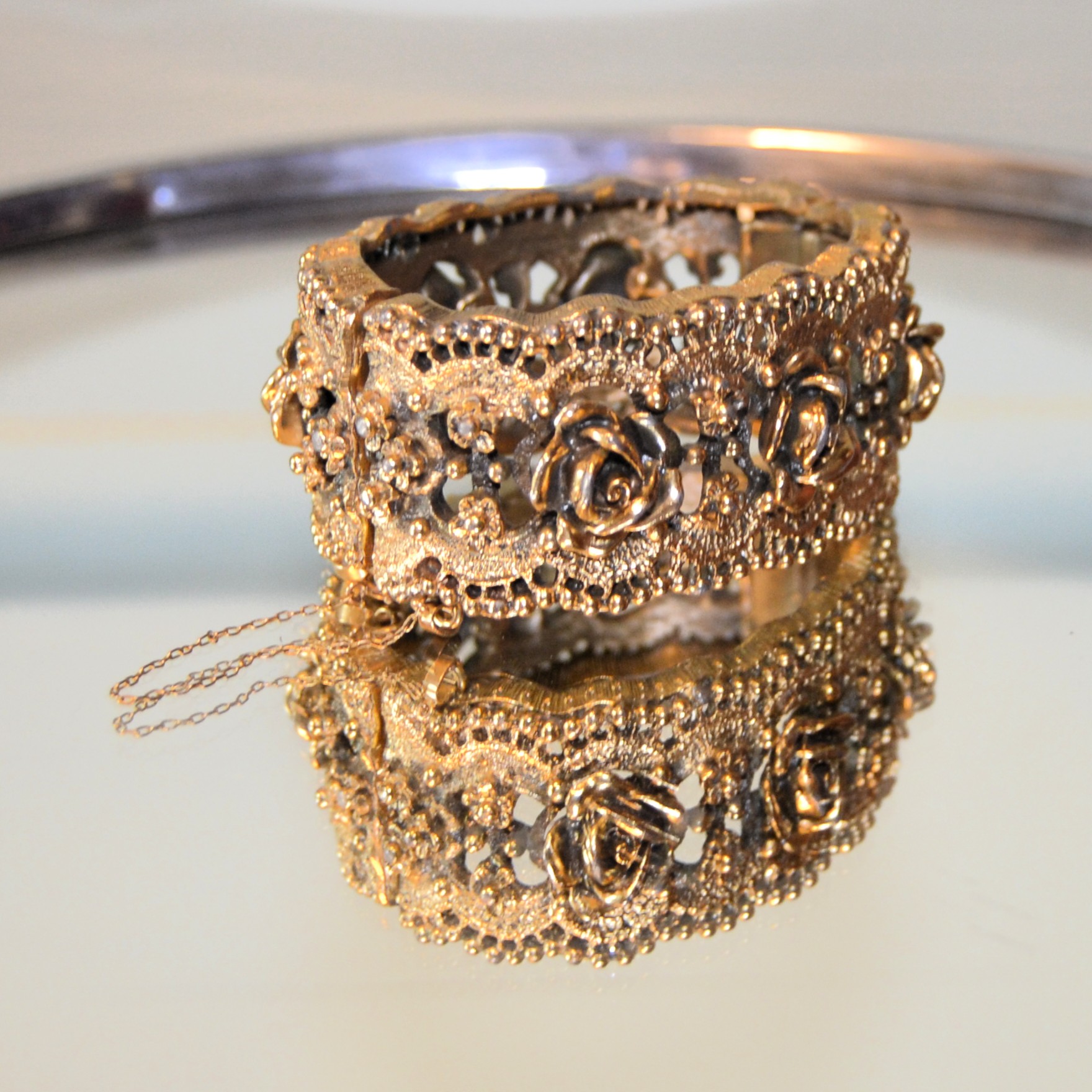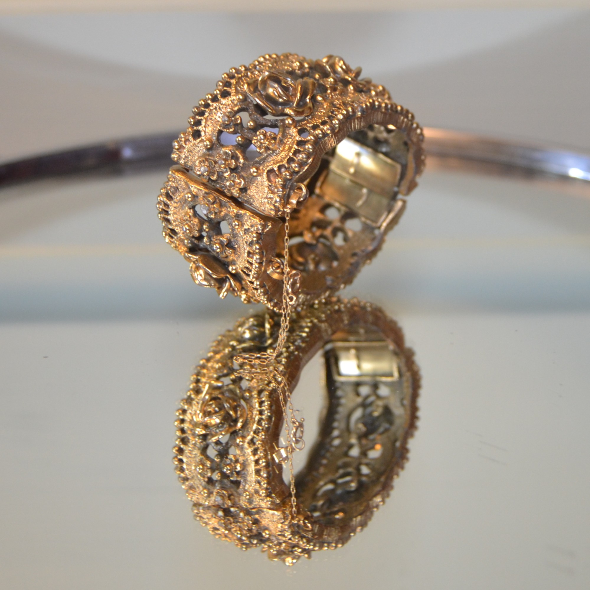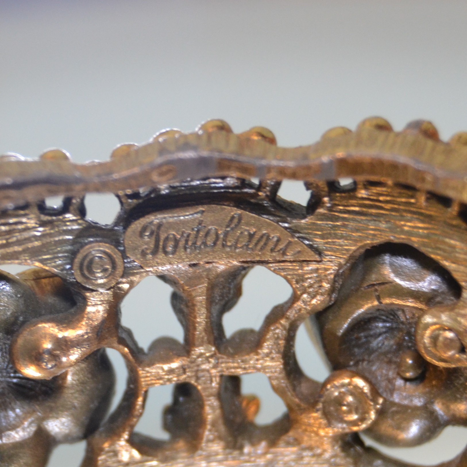 Bracciale TORTOLANI anni Sessanta in lega tono oro antico. Motivo a boccioli. Chiusura a poussoire e catenella di sicurezza. Marchio TORTOLANI sul retro vicino alla chiusura.. Condizioni ottime.