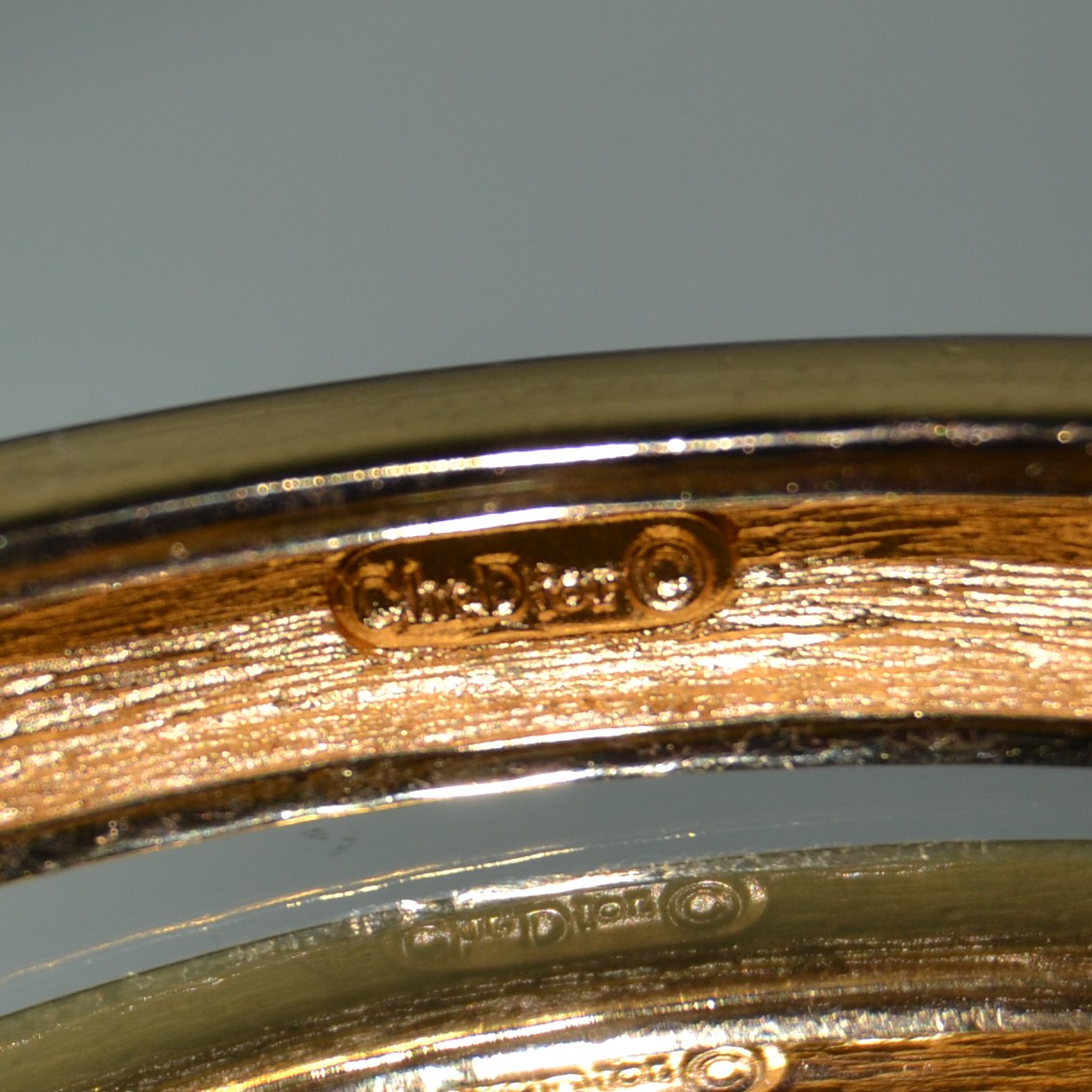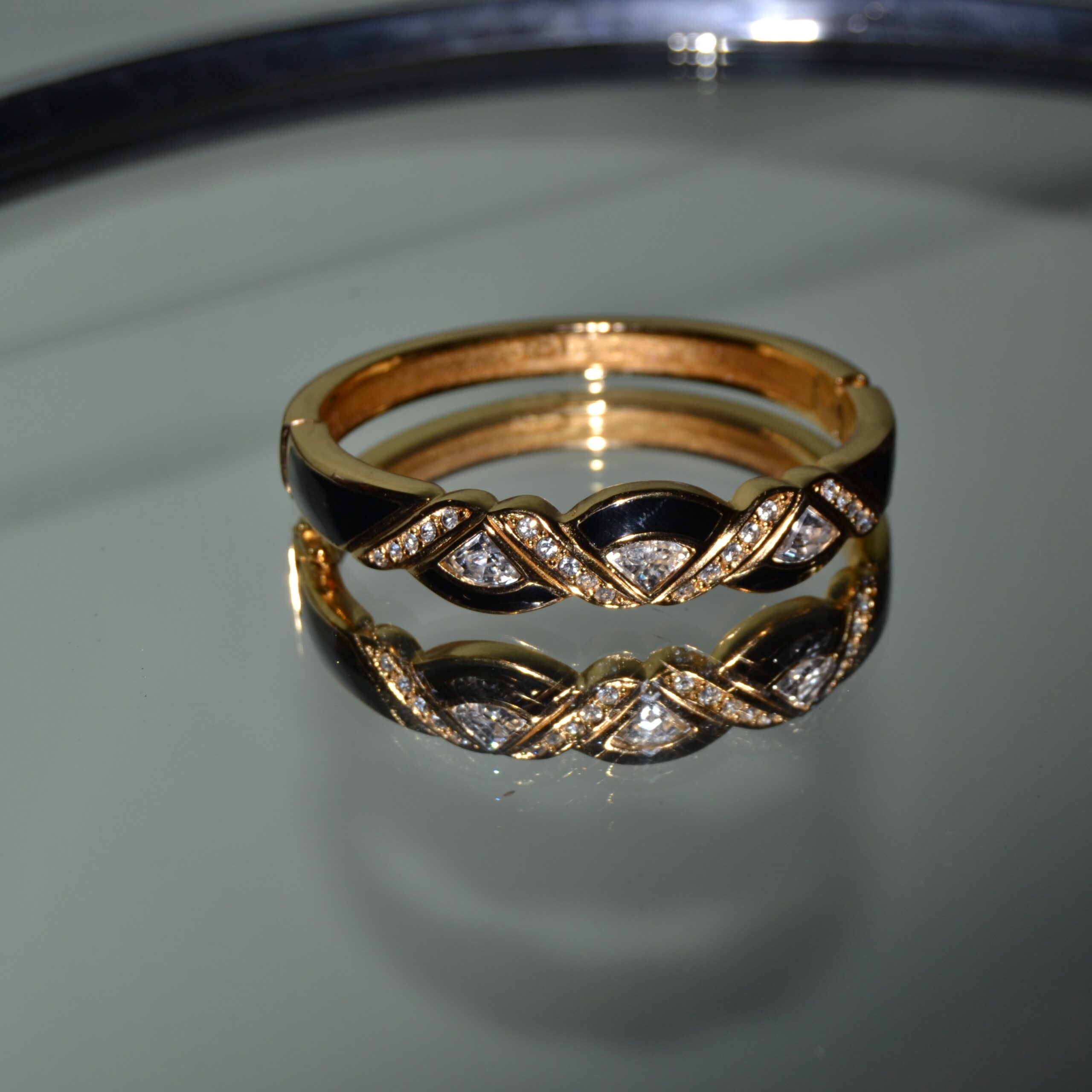 Bracciale bangle vintage DIOR anni ottanta “DAMA NERA” in lega tono oro e smalto nero con cristalli Swarovski. Marchio Chr.Dior all’interno. Diametro cm.6. Condizioni perfette.