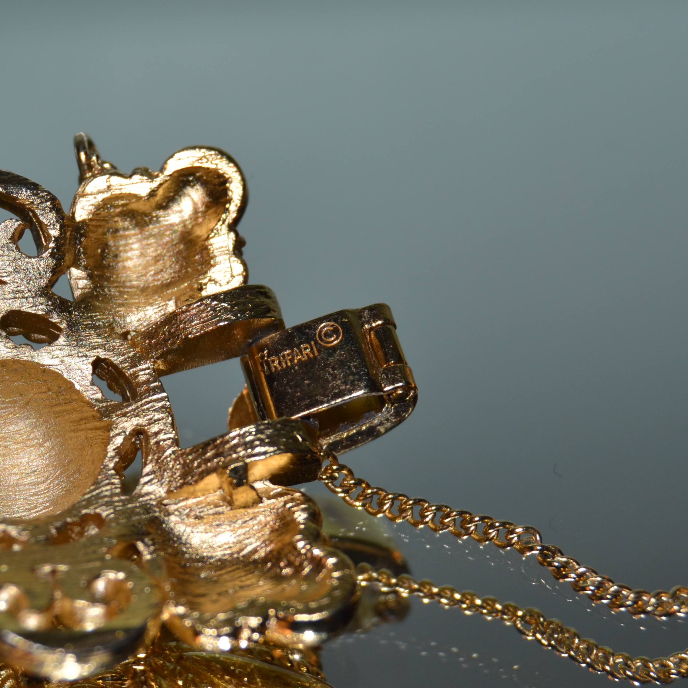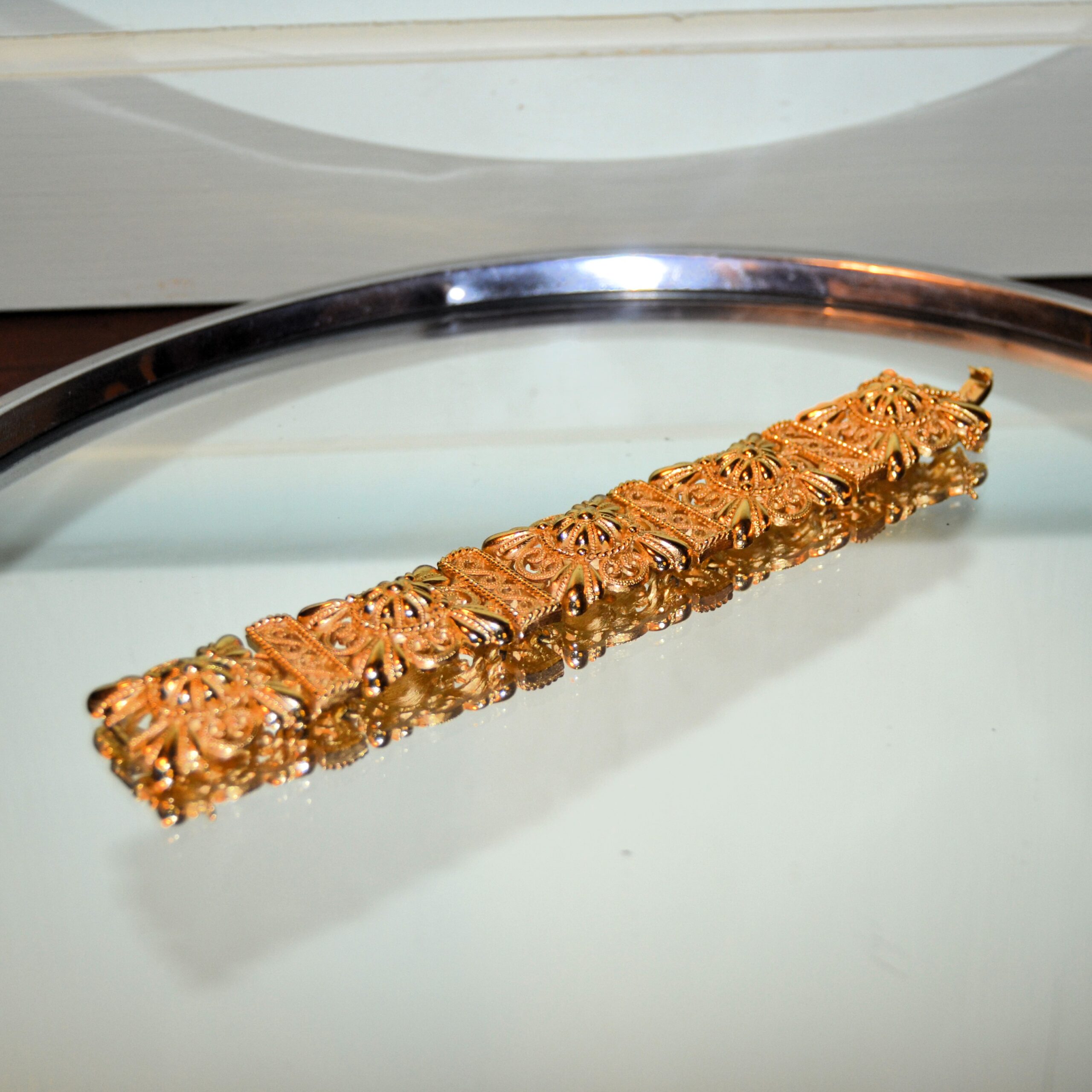 Bracciale vintage TRIFARI anni sessanta “BAROCCO” in lega tono oro. Marchio TRIFARI alla chiusura. Catena di sicurezza. Lunghezza da aperto cm.19 altezza cm.2,5. Condizioni perfette.