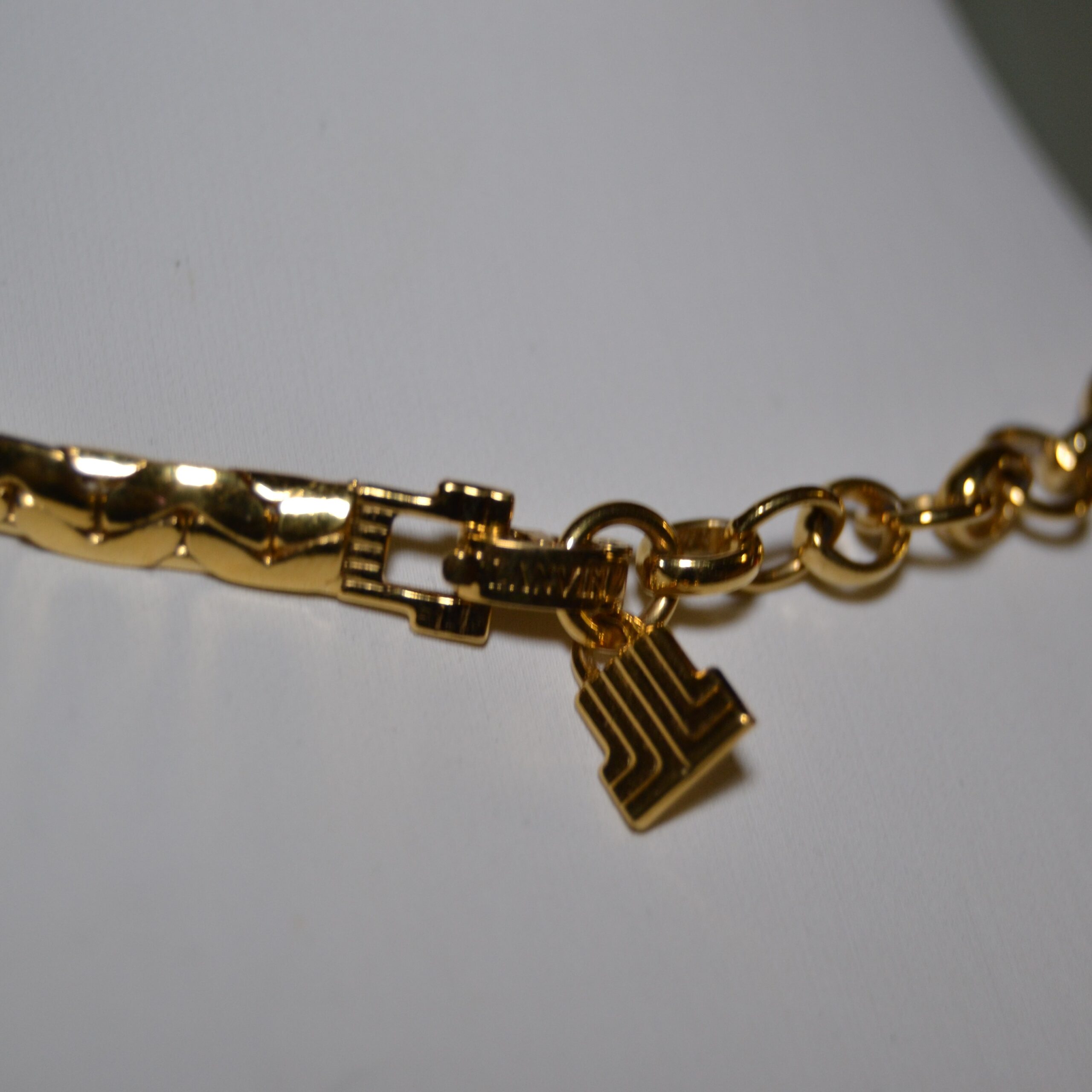 Collana vintage LANVIN “Emeraude” anni Settanta in lega tono oro con cristalli swarovski bianchi e cristallo verde smeraldo. Condizioni perfette. Marchio LANVIN GERMANY alla chiusura e sul retro del pendente. Dimensioni max. lunghezza regolabile cm. 42