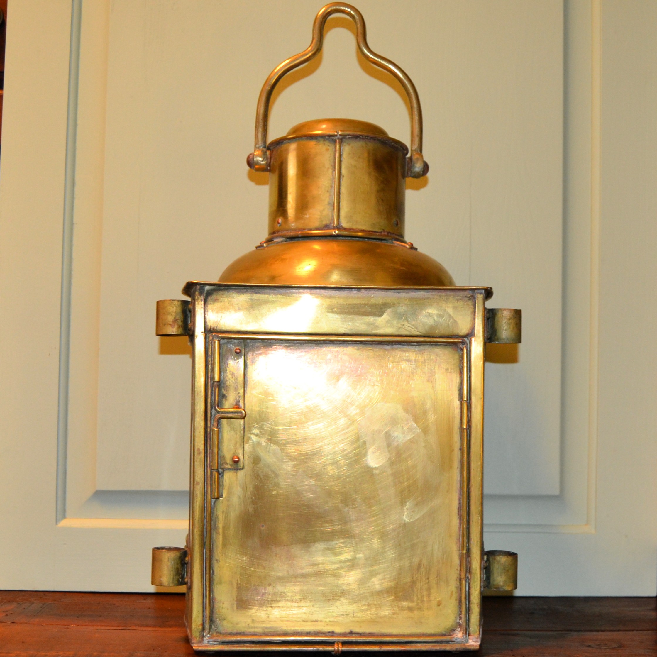 Lanterna navale in ottone con lente di Fresnel di inizio Novecento. La lampada è stata cablata a norma di legge sostituendo al portacandela preesistente un portalampada in ceramica.