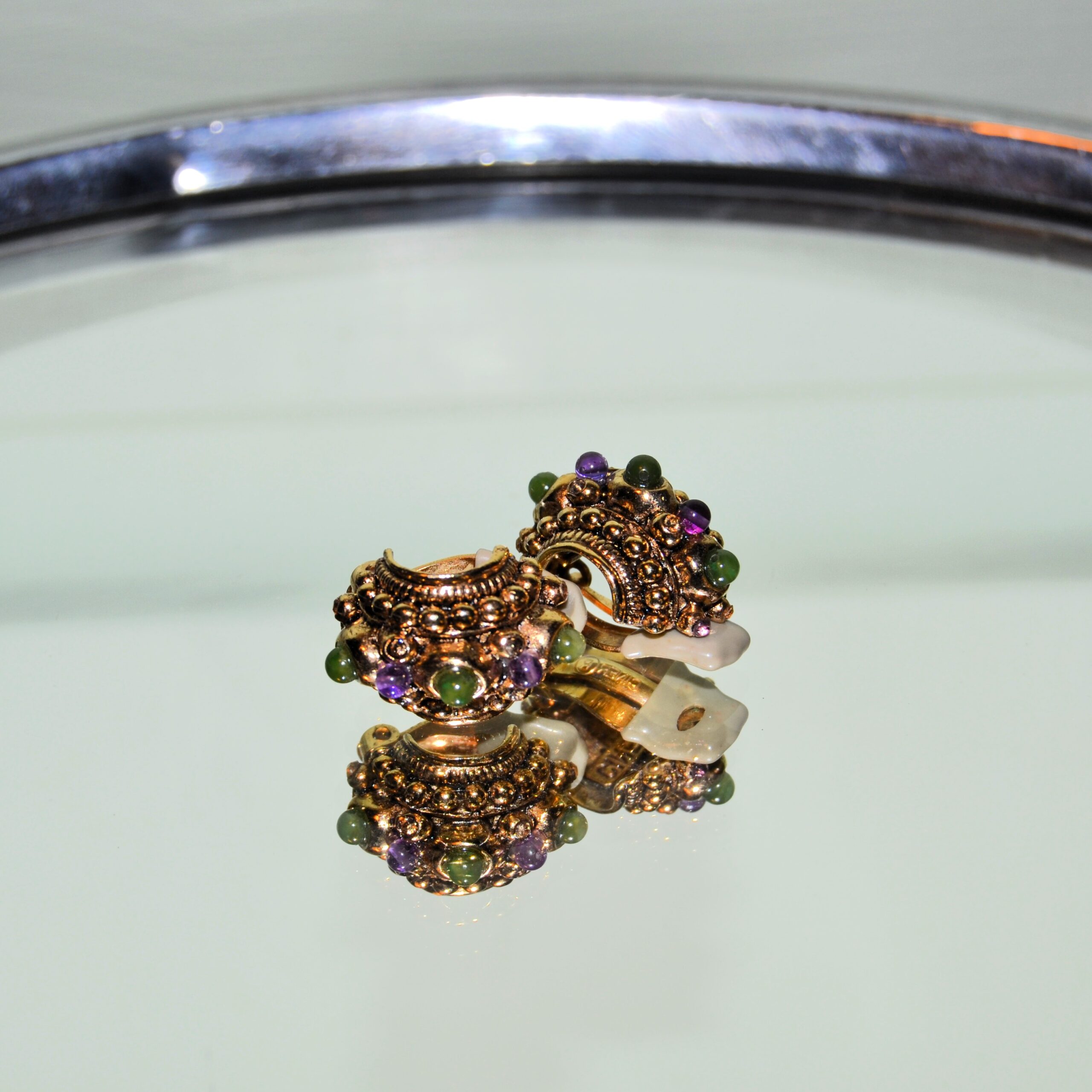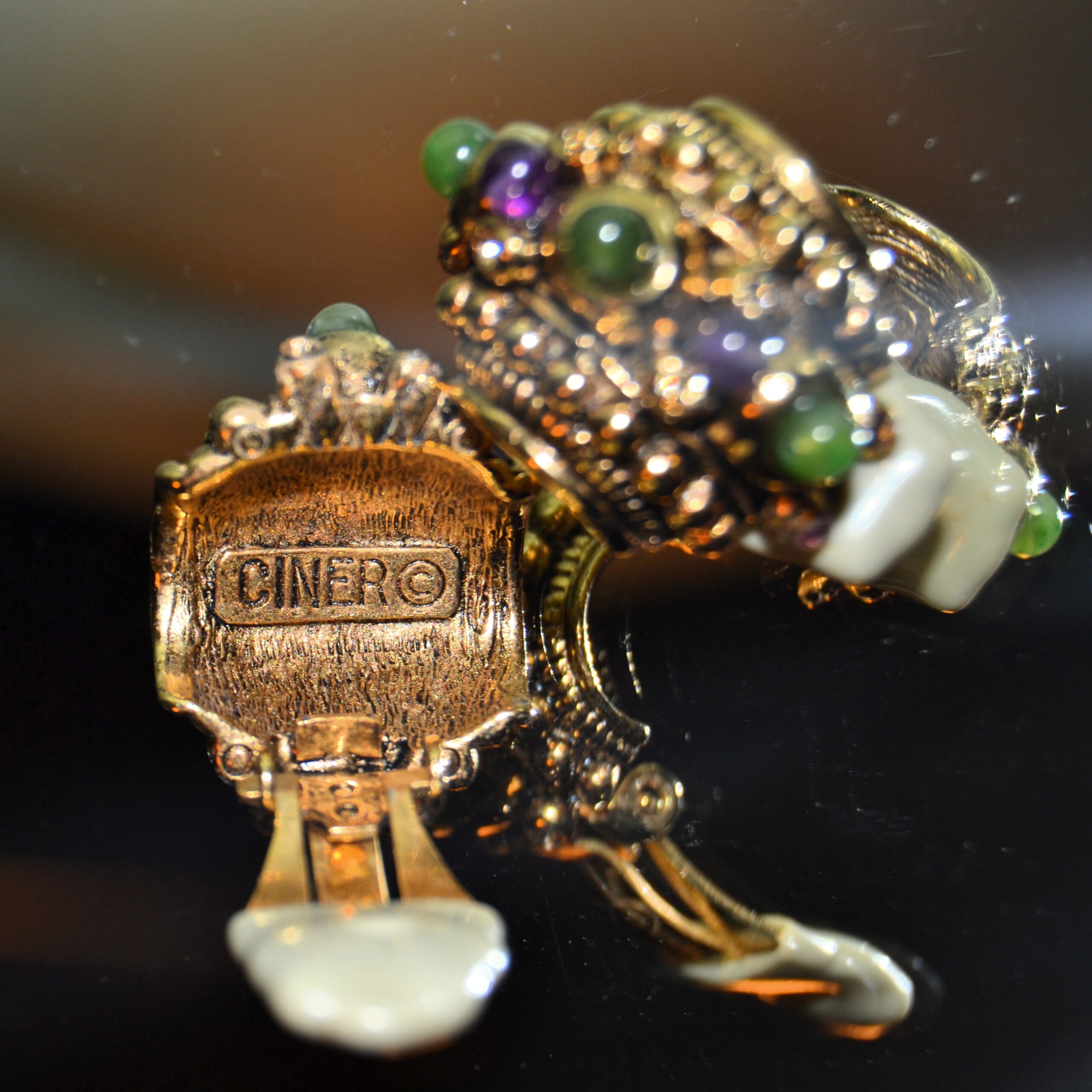 Orecchini vintage CINER anni Cinquanta a clip. Lega tono oro con cristalli e pietre dure. Marchio CINER all’interno. Condizioni eccellenti.