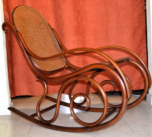 Sedia a dondolo (rocking chair) in faggio piegato THONETmodello n° 10. Altezza massima cm. 80. Rara misura di dimensioni ridotte per piccoli ambienti come mansarde.