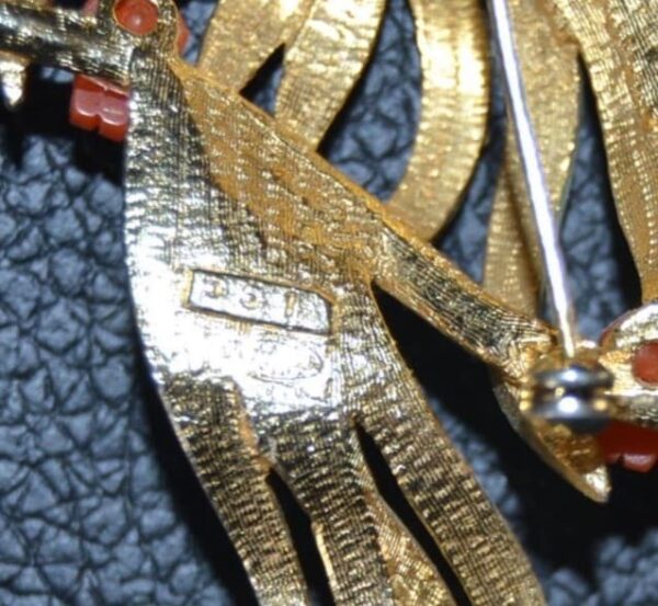 Spilla in lega tono oro con smalti blu e verdi e lucite arancione