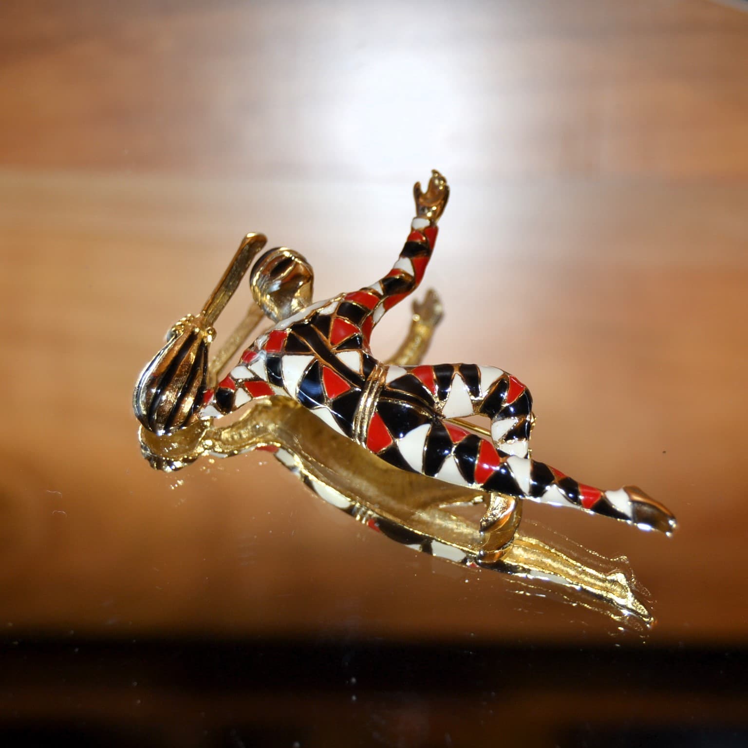 Spilla vintage americana anni Sessanta “ARLECCHINO” ME JEWELS in lega tono oro e smalti policromi – Marchio ME INC. sul retro – Lunghezza cm. 7 – Condizioni perfette