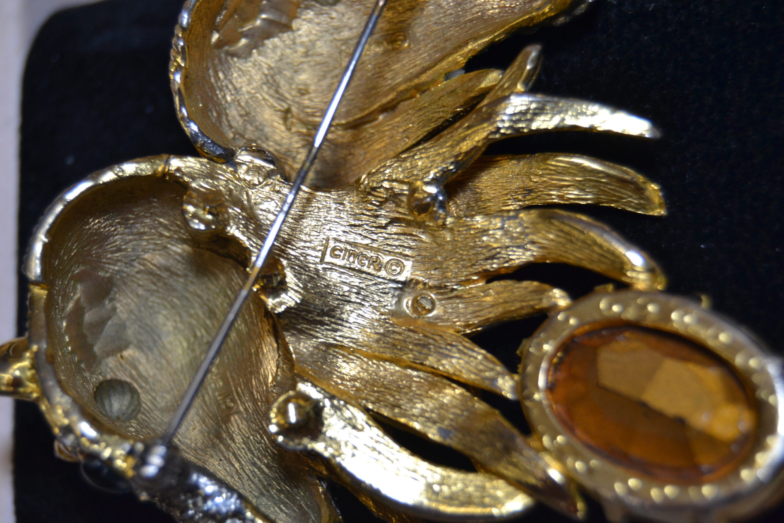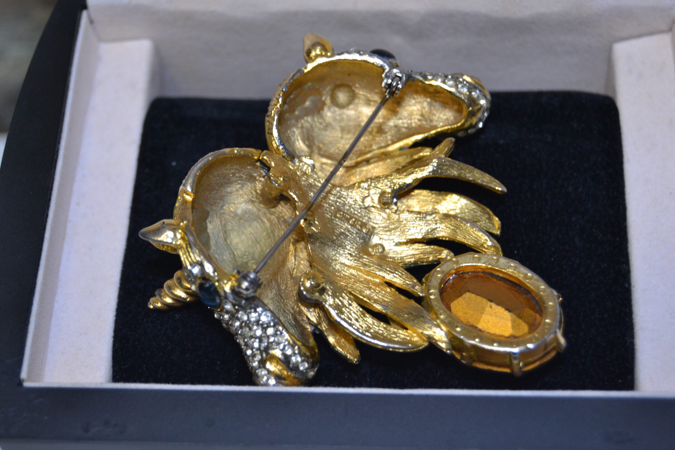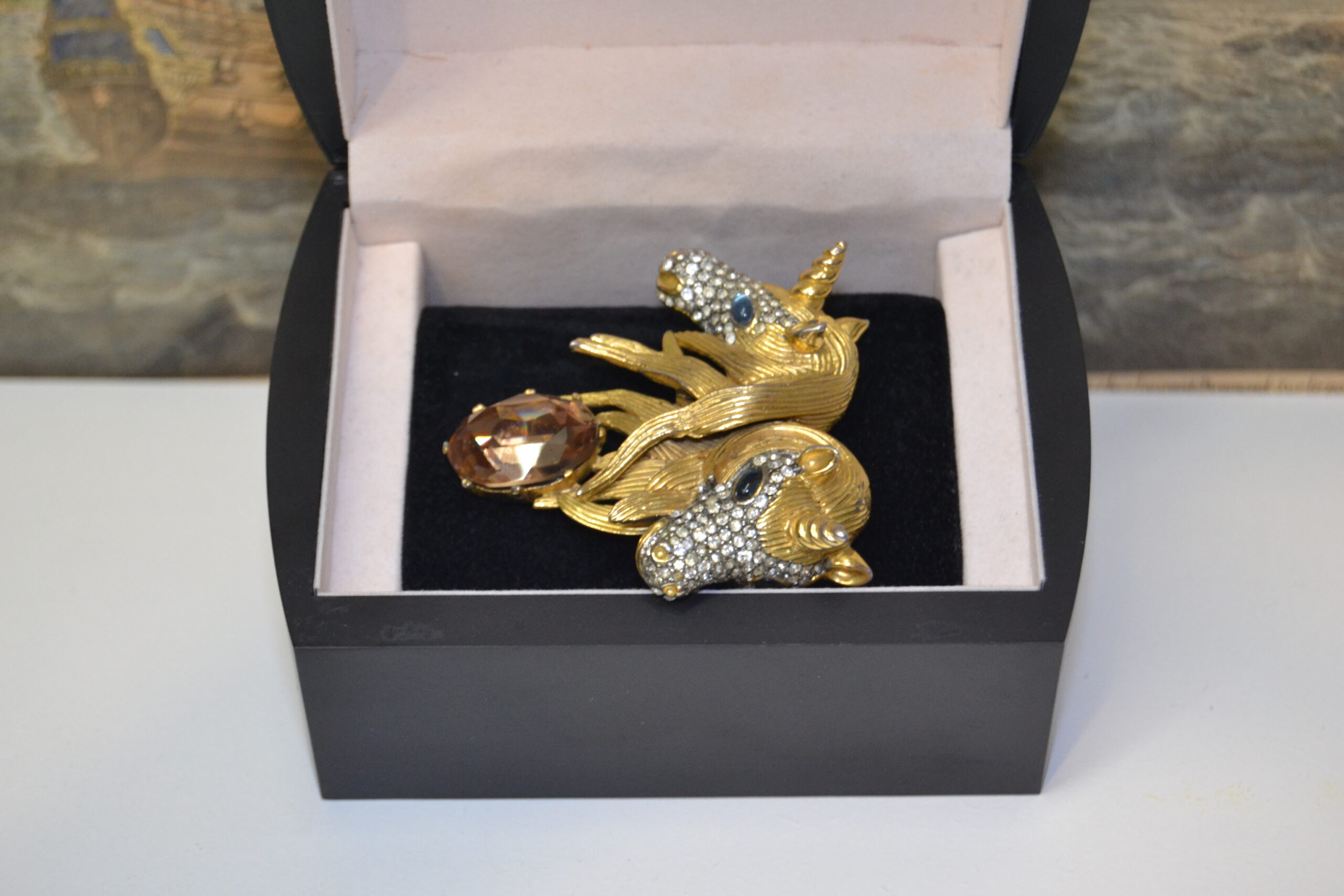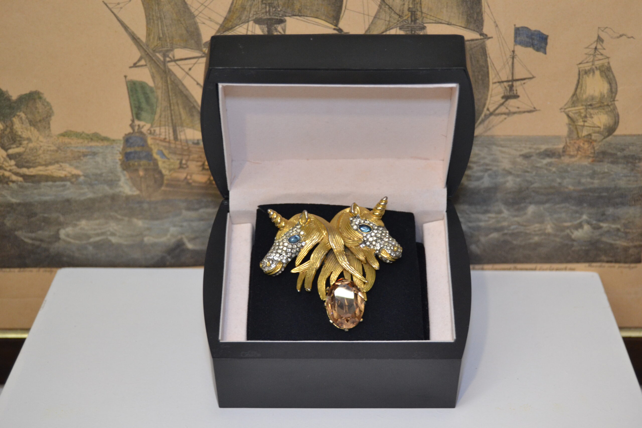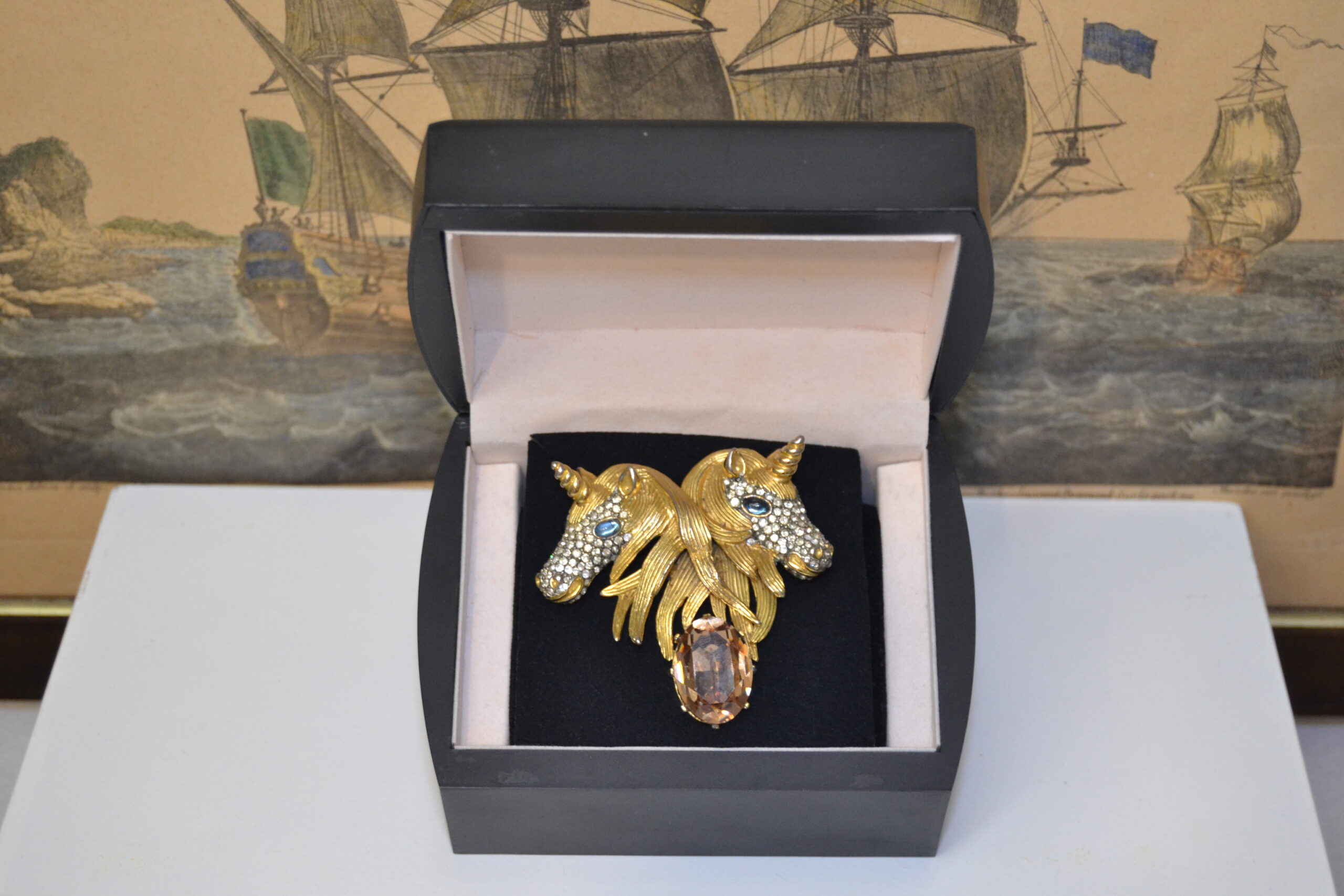 Spilla vintage in metallo tono oro con cristalli policromi e un grande cristallo color champagne rosato, raffigurante una coppia di unicorni. Marchio CINER sul retro. Anni Cinquanta. Dimensione cm. 7 x 7. Edizione limitata di assoluta rarità. Condizioni ottime.